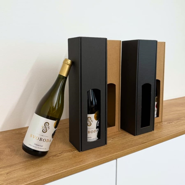 SlovenskoElegantní dárková krabice na víno s důmyslnou konstrukcí, která dobře láhev ochrání a použijete jí také jako odnosný obal.