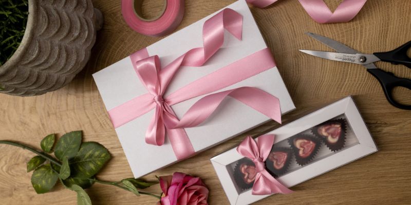 Krabičky, stuhy i hedvábné papíry. To vše jsou balicí materiály, se kterými si můžete různě vyhrát, podle sezóny. K Valentýnu se skvělé hodí např. růžové dárkové krabičky. Krásného efektu však docílíte např. s bílými krabičkami, růžovou stuhou a hedvábným papírem.